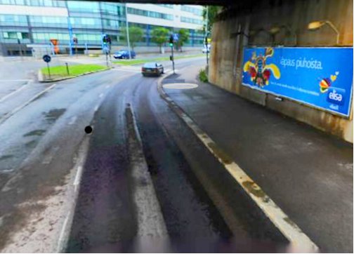 Hätkähdin ja katsoin olkani yli vasemmalle, josta ääni kuului. Samalla kun katsoin, suuri auto ajoi jalkakäytävää pitkin aivan vierestäni ohitseni ja jatkoi kovaa vauhtia matkaansa eteenpäin kohti Hatanpään valtatien risteystä.